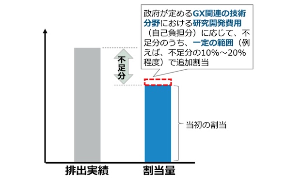 ただし本制度では、リーケージリスク勘案措置による追加割当と、この研究開発勘案措置による追加割当の同時適用が可能であるため、削減インセンティブを保つ観点から、不足する排出枠の量の「0.1倍」(10%)を割当量の上限とする案が示された。また、二重支援を避ける観点から、政府による研究開発支援を受けている場合、当該支援額は控除される。