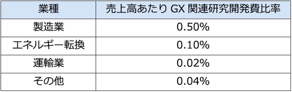 研究開発費の水準は業種により異なるため、表2のような「売上高あたりGX関連研究開発費比率」の基準を定め、これに各社の売上高を乗じて算定することとする。