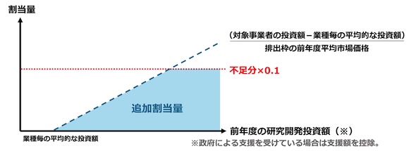 本措置は、あくまで積極的なGX研究開発を行う事業者への配慮措置であるため、業種ごとの平均的な水準を超えて研究開発投資を行う事業者に限定して、排出枠の追加割当てを行うものとする。