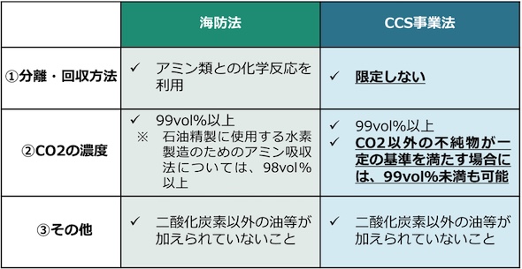 他方、近年ではアミン類を用いた吸収法以外の分離・回収方法も検討されていることを踏まえ、CCS事業法では、アミン類を用いた吸収法に限定しないこととした。