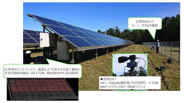 東北電力とアイテスはこのPL検査の時間帯や場所の制約といった課題解決に向けて、日中時間帯の屋外で検査が可能なシステムの開発に取り組んだ。具体的には、赤外線を撮影できる特殊なセンサー(InGaAs撮影素子の冷却型)と、検査に必要な波長だけを通すフィルターを搭載した専用カメラを利用し、日中時間帯の屋外で太陽光パネルを撮影する。次に撮影した写真をその場で専用ソフトウェアで解析することで、不具合の発見が可能になるとしている。