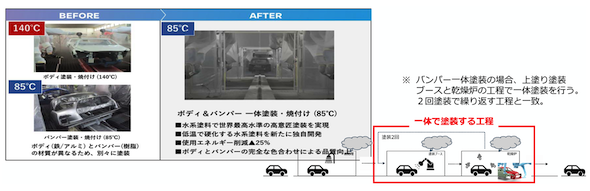 また、従来別々に塗装されていたボディとバンパーを一体で塗装することにより車両一台当たりのCO2排出量を削減する新技術は、ボディ塗装排出量の増加とみなされないようにこれを補正し、排出原単位算定の際は塗装面積増加分を加味した基準活動量を算出する。