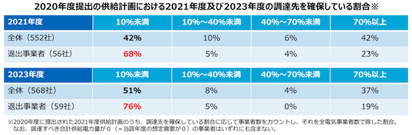 これを踏まえ、資源エネルギー庁事務局では、退出に至った小売事業者と小売事業者全体の調達傾向を比較調査した。具体的には、2022〜2023年の小売事業者全体及び同期間に退出した小売事業者(※事業継続の意思が認められる事業者)について、2020年度に提出のあった「供給計画」上で、1年後(2021年度)及び3年後(2023年度)にどのような調達計画を立てていたのかを分析した。