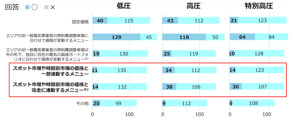 論点の一つが、市場連動メニューなど多様な小売料金メニューとの関係性である。資源エネルギー庁が2023年に行ったアンケートによれば、市場価格と一部または完全に連動する料金メニューを提供していると回答した小売事業者は図2の通りである。