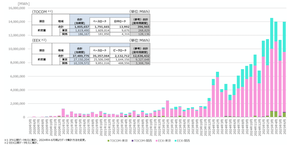 2025年4〜6月四半期における電力先物の約定実績は、TOCOMで約18億kWh(前年同期比4.5倍)、EEXでは約375億kWh(前年同期比3.0倍)と急速に普及が進んでいる。