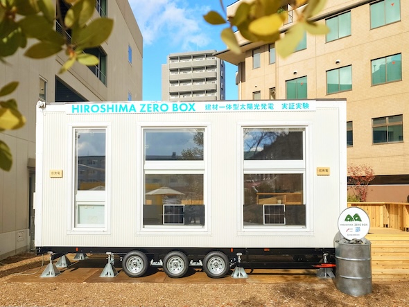 実証では、中電工業が2025年4月から広島市南区出汐で展開する地域交流広場「ヤマヤマミタ」に、YKK APが開発する建材一体型太陽光発電の実証実験ハウス「HIROSHIMA ZERO BOX(ヒロシマ・ゼロ・ボックス)」を設置。長さ約6.0m、幅約2.5m、高さ約3.5mの実証用ハウスで、ここにペロブスカイト太陽電池を内窓に採用した内窓設置タイプのBIPVの他、単結晶シリコンを使ったBIPVを内窓や壁に設置している。