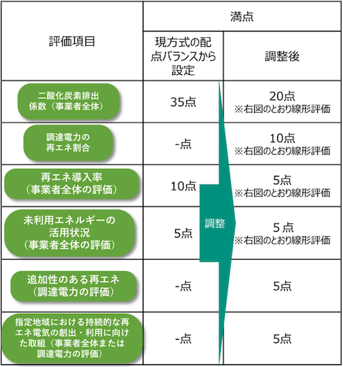 調達者がこの加点項目配点例を用いる場合、「二酸化炭素排出係数(事業者全体)」では、削減努力に見合った評価がなされるよう、0.435〜0.250 kg-CO2/kWhの間で0〜20点が直線的に配点され、0.435を上回る場合は減点となる。