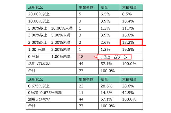 あまり基準値を上げすぎると、表6のボリュームゾーンである1%以下の事業者の評価に差がつかないことを考慮し、基準値上限を2%に上げたうえで、0〜2%の間で1〜5点を直線的に配点することとした。