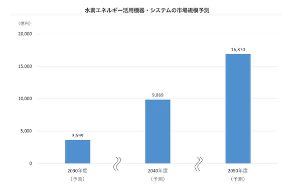 2030年代以降は、2020年代と比較して調達可能な水素の量が増えるとともに、水素調達コストの低減が進む可能性を考慮すると、水素エネルギー活用機器・システムの市場規模は中長期的に拡大していく見通し。そうした結果、2040年度の水素エネルギー活用機器・システムの市場規模は9869億円、2050年度には1兆6870億円になると予測している。
