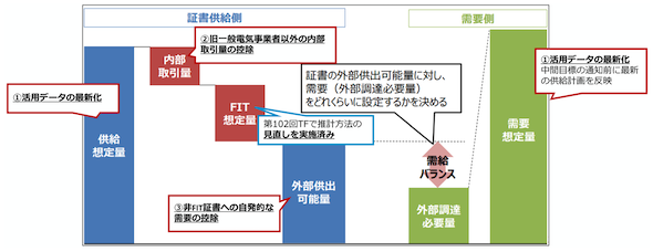 資源エネルギー庁では、高度化法における2040年度の非化石電源比率目標を60%以上とする案をすでに示しているが、非FIT証書の需給バランス等を踏まえ、毎年度の中間目標値をどのように設定すべきか、「制度検討作業部会」において検討が行われた。
