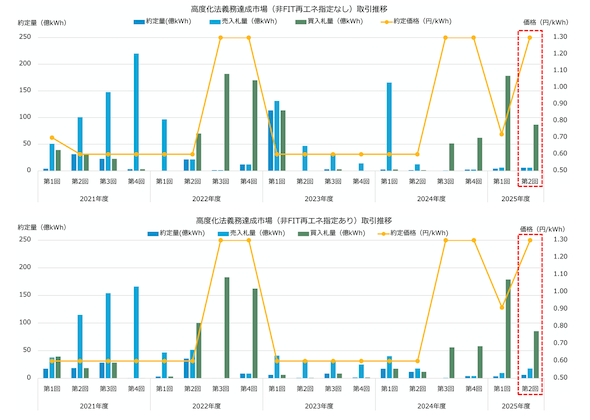 現在、高度化法の順守に使用可能な「非FIT非化石証書」は高度化法義務達成市場において、またボランタリーな使用が想定される「FIT非化石証書」は再エネ価値取引市場において取引が行われている。