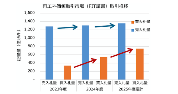 また、FIT証書はこれまで供給(売入札量)が需要(買入札量)を大きく上回ってきたため、再エネ価値取引市場(マルチプライス方式)の約定価格はほぼ下限価格(2021年11月以降0.3円/kWh、2023年8月以降0.4円/kWh)に張り付いている。ただし近年、FIT証書の買入札量が増加しており、将来的には需給バランスが逼迫する可能性も否定できない。