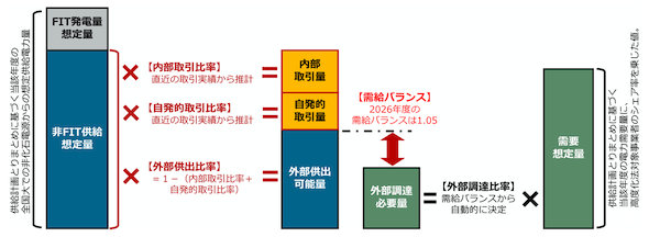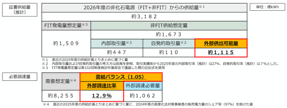 ここで、2026年度の需給バランスは「1.05」とするので「1,115億kWh÷1.05=約1,062億kWh」が外部調達必要量となる。制度対象者全体の需要想定量は約8,255億kWhであるため、外部調達比率は「12.9%」となる。