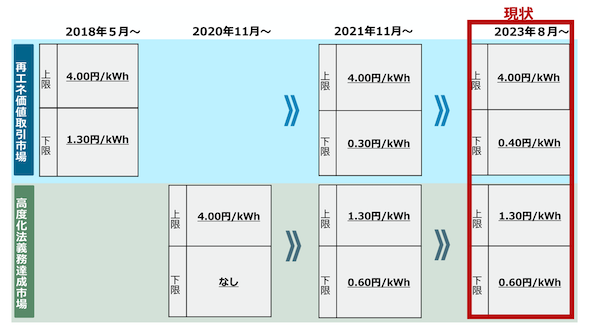 非化石証書は、再エネ電源投資インセンティブの確保や価格高騰への対策として、それぞれ上下限価格が設けられており、幾度か変更も行われてきた。