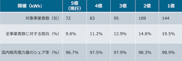 義務対象とする閾値を仮に5億kWhから引き下げた場合の対象事業者数とシェア(制度カバー率)は表1の通りであり、閾値1億kWhの場合、事業者数は2倍となるがシェアは2.2%の増加に留まる。