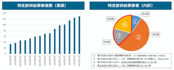 国は、電気事業法の新たな事業区分として2022年4月に特定卸供給事業制度を開始したが、2025年11月現在、特定卸供給事業者(アグリゲーター)は129社、合計供給能力は約5,300MWに上る。