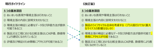 このため、環境表示ガイドライン改定版では、「製品のライフサイクルにおける、関連する側面のすべてを考慮すること(プラス面だけでなく重大なマイナスの影響はないか)」を基本項目に追加(格上げ)することとした。なお、基本項目③と⑤は相互に関連するため、一項目に統合する。