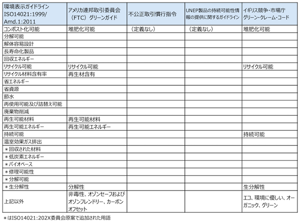 さらに、ISO 14021等で、解釈や使用する際の条件等が定義されている用語を全て列挙し、同規格への準拠を促すこととする。