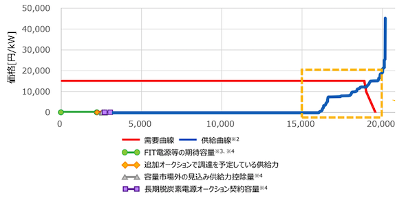 図2の供給曲線の緑色部分は、FIT電源の期待容量1,755万kWと、石炭とバイオマスの混焼を行うFIT電源の供給力471万kWの合計2,226万kWであり、オレンジ色部分は追加オークションで調達を予定している供給力324万kW(H3需要の2%分)、灰色部分は容量市場外の見込み供給力控除量177万kW、紫色部分は長期脱炭素電源オークション契約容量(2029年度に稼働予定供給力)343万kWである。