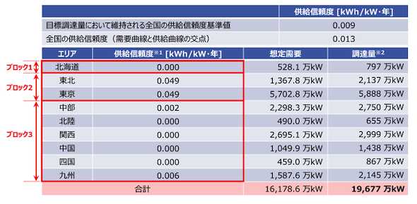 容量市場メインオークションでは、全国約定処理後の供給信頼度を確認し、不足エリア(ブロック)で、全国の供給信頼度を満たすまで電源の追加処理を行うこととしている。しかしながら、東北・東京エリア(ブロック)では、不足エリアのまま追加できる電源がなくなったため、その時点で約定処理は終了された。このため、東北・東京の供給信頼度0.049kWh/kW・年は、全国の基準値0.009kWh/kW・年を満たさない結果となった。