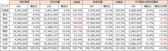 エリア別の2029年度想定需要やオークション約定容量等を比較したものが表7である。東京・北陸・中国エリアでは、メインオークション約定容量がエリア内想定需要を下回っているが(「対需要」列が100%未満)、FIT電源の期待容量等を含めた調達容量全体としては、すべてのエリアで需要を一定程度上回っていることが分かる(全国合計では約22%超過)。