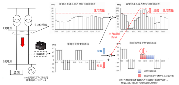 「計画値制御」とは、あらかじめバランシンググループ(BG:この場合、系統用蓄電池事業者)の発電計画/需要計画作成の断面で想定潮流を計算し、潮流計算値が系統設備の運用容量を超過した際に、蓄電池の充電出力予定値を抑制する制御手法である。