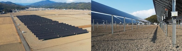 同発電所は、クリーンエナジージャパン(横浜市)が開発した、太陽の動きに合わせて太陽光パネルの角度を自動制御する可動式架台と、両面受光型の太陽光パネルを組み合わせたシステムを採用。太陽の動きや水稲の生育期・非生育期に応じてパネル角度を自動制御することで、農業と発電を両立する。