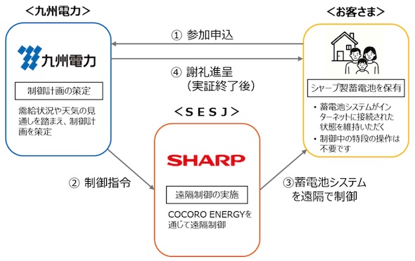 今回の実証では、シャープエネルギーソリューションがが運用するHEMS(ホームエネルギーマネジメントシステム)サービス「COCORO ENERGY」の仕組みを活用し、シャープ製の家庭用蓄電池を、太陽光発電が多く稼働する昼間に充電、電力需給が厳しくなる夕方等に放電するよう遠隔制御する。これにより、九州エリアにおける再生可能エネルギーの有効利用を広げる狙いだ。