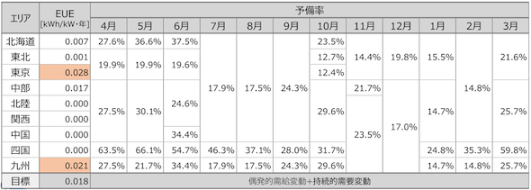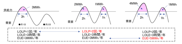各指標の評価対象として、EUE評価では原則、実需給年度全体(8,760時間)を通じた評価を行うのに対して、予備率評価は各時間帯(各コマ)に対して行うという大きな違いがある。