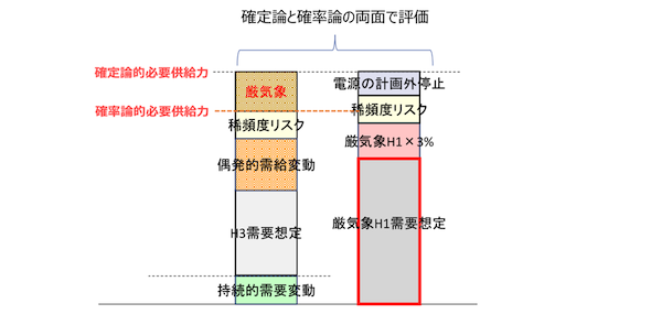 また現在、安定供給確保のために必要な供給力は、平年H3需要に対する必要供給力(EUE評価に基づく確率論的な必要供給力。図3左)と厳気象H1需要に対する必要供給力(予備率評価に基づく確定論的な必要供給力。図3右)のうち、いずれか大きい方であると整理されている。近年は確定論的必要供給力の方が大きい傾向にあるため、確率論的必要供給力と確定論的必要供給力の差分を「厳気象対応」として確保している。