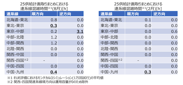 他方、EUE算定は全時間帯を評価対象とするため、表2では複数の連系線において混雑が発生している。東京エリア向きに流れ込む「東北→東京」や「東京←中部」は8月に、九州エリア向きに流れ込む「中国→九州」は8月と2月に混雑が発生しており、このことが、表1でこれらのエリアのEUE評価が悪化する原因となっていると考えられる。