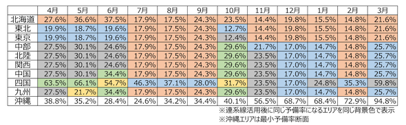 評価断面の違いは、地域間連系線の混雑による影響の違いとなって表れている。なお、供給力評価における連系線の使用や混雑とは、一般的なkWh取引上の概念と異なるため、表2の混雑時間も一般的な混雑時間とは全く異なる数値となっている。