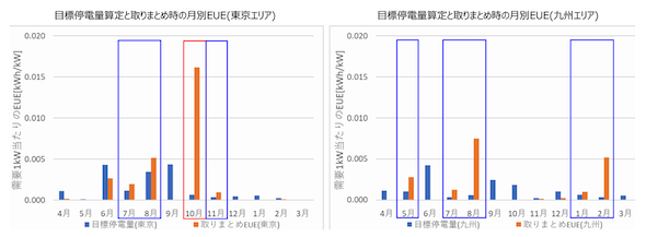なお本来、EUEは年間評価の指標であるが、広域機関事務局では参考値として月別に展開したEUEを示しており、東京エリアでは8月に、九州エリアでは8月と2月にEUEが高いことが確認できる。