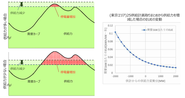EUEは供給力の増減に対応して直線的に上下するものではなく、供給力が少ない状態であるほど、単位当たりの供給力の変化に対して、EUEは大きく上下するものである。図6左上のように供給力が多い場合は、供給力が1単位減少しても停電量の増加はわずかであるが、図6左下のように供給力が少ない場合、供給力が1単位減少すると、停電量(赤い面積)は大きく増加することとなる。