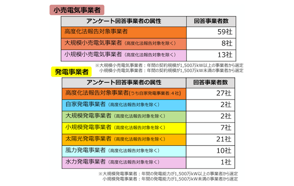 アンケート等の対象は、大規模及び小規模双方の発電事業者及び小売事業者であり、選定164社のうち、115社(小売80社、発電70社。小売・発電双方の立場の場合もあり)から回答が得られた(回収率71%)。なお、昨年は対象145社のうち、126社(小売83社、発電70社)から回答が得られた(回収率87%)。