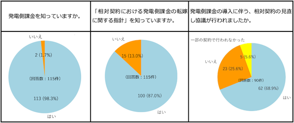 今年度のアンケート調査の主な結果は表4の通りである。発電側課金自体はほぼすべての事業者が認知しており、発電側課金の情報の入手先は、資源エネルギー庁のホームページや一送からの通知文が上位を占めていた。「転嫁ガイドライン」を知っていると回答した事業者は昨年の83%からやや上昇し、87%となった。