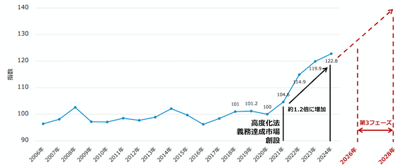 高度化法義務達成市場(非FIT証書)が創設された2021年から直近2024年度における国内企業物価指数は約1.2倍に上昇しており、このトレンドが今後も継続すると、第3フェーズの最終年度である2028年度には、同市場創設時点の1.4倍程度となることが想定される。