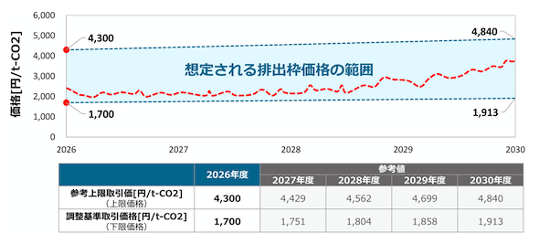 なお、2026年度から排出量取引制度が開始され、その第2フェーズ(2026〜2030年度)初年度の下限価格は1,700円/t-CO2と設定されている。これを、「1.LNG火力の排出係数(0.000386 t/kWh)」「2.全国平均排出係数(0.000423 t/kWh)」で電力量(kWh)に換算すると、それぞれ、1=0.66円/kWh、2=0.72円/kWhとなり、非FIT証書市場価格の下限0.8円/kWhという水準は、排出量取引によるインセンティブとのバランスも一定程度確保できていることが確認された。