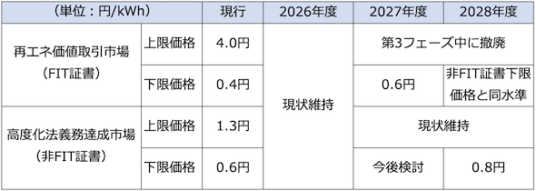 高度化法義務達成市場(非FIT証書)の現行の上限価格1.3円/kWhについては、小売電気事業者の高度化法義務履行の費用負担の上限として当面は適切な水準であるとして、第3フェーズ(2026〜2028年度)中はこれを維持することとした。