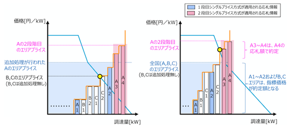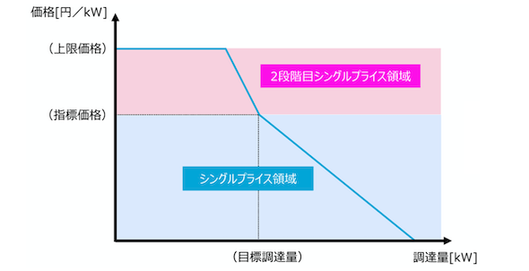 この案の場合、指標価格までは現状どおり、原則シングルプライス方式で約定価格を決定し、指標価格以上・上限価格以下の領域の応札については、2段階目のシングルプライス方式を適用することとなる。2段階目のシングルプライスは、「2段階目シングルプライス領域」内の最も高い電源の応札額が適用される。