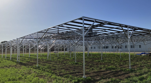 実証を行う設備は千葉大学「柏の葉キャンパス」内に設置。発電と農業を両立する営農型太陽光発電システムとして、水田の上に太陽光発電を設置した。太陽光発電モジュールにはフィルム型ペロブスカイト太陽電池を用いたレンズ型モジュールを採用しているのが特徴だ。