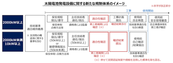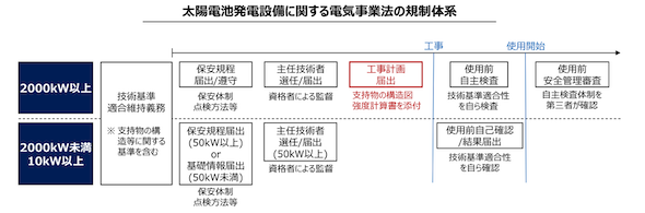 電気事業法では、出力10kW以上の太陽光発電設備については、設備容量にかかわらず、技術基準に適合するよう維持することが義務付けられている。また、出力2,000kW以上の太陽光発電設備については工事計画の届出を義務付けており、経済産業省が当該届出に添付される支持物の構造図や強度計算書等を確認することで、着工前に設計の適切性を担保する仕組みとしている。