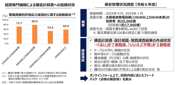 また、2022年の電気事業法改正により、基礎情報の届出や使用前自己確認の結果届出が義務付けられた小規模事業用電気工作物(10kW以上50kW未満)を対象として実施されている保安管理状況調査においても、構造計算書等の存在を確認できなかった事業場が約3割であった。