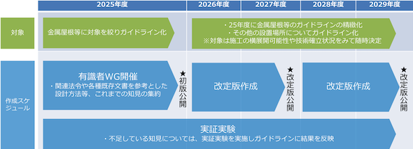 このため、NEDOでは実態に応じた安全な施工や維持管理の方法を検討し、ペロブスカイト太陽電池をはじめとする「フレキシブル太陽電池を利用した太陽光発電システムの設計・施工ガイドライン」を作成し、2026年3月18日に公開した。