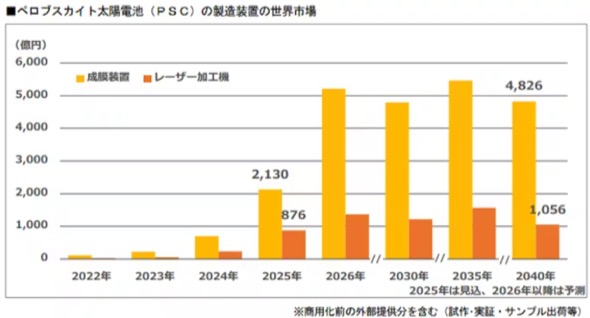 富士経済は2026年3月26日、成膜装置やレーザー加工機などペロブスカイト太陽電池の製造装置市場に関する調査結果を発表した。それによると、成膜装置の世界市場は2040年までに2024年比6.9倍、レーザー加工機は同4.5倍に拡大する見通しとしている。