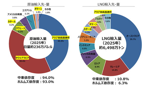 日本は化石燃料のほぼ全量を海外から輸入しており、ホルムズ海峡を経由する原油の輸入は9割を超える。今般の中東情勢を受け、原油タンカーがホルムズ海峡を事実上通れない状況となり、3月下旬以降、中東から日本への原油輸入は大幅に減少している。