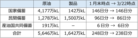 なお経済産業省は、石油備蓄法第31条に基づき、約850万kL(1カ月分に相当)の国家備蓄原油を3月26日以降、順次放出することを決定している。
