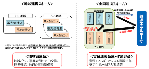 また、国内事業者にLNGの安定調達に支障を来す事態が生じた場合に備え、国は2021年に、「地域連携スキーム」及び「全国連携スキーム」を整備済みである。万一、事業者間の取り組みだけでは対応できない場合、資源エネルギー庁が電力・ガス会社間のLNG融通の仲介を行う仕組みとされている。