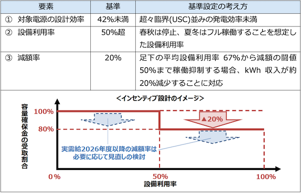 これを踏まえ、供給力(kW)の確保を目的とする容量市場では、2025年度から非効率石炭火力を高需要期のみの稼働へ誘導する措置を開始している。具体的には、設計効率が42%未満の石炭火力を対象とし、設備利用率が50%を超える電源の容量確保契約金額を20%減額し、発電電力量を抑制するインセンティブを与えている。