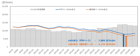 広域機関では、高需要期である夏季と冬季において、発電事業者の燃料在庫・調達状況を確認し、把握した燃料在庫の状況から導出される日本全体の発電可能量(kWh)と過去データから予測される需要量を比較することで、2カ月先までのkWh余力(燃料在庫)の見通しを隔週で公表している。2025年度冬季のモニタリングは、3月31日までを対象とした2月20日公表分で終了しており、例年であれば夏季にモニタリングが再開される。